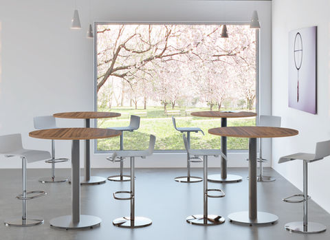 Our new disc bases come in black, silver, or chrome in both cafe and bar height to suit a variety of needs for your workspace. Whether you need a cluster of break room tables, a small conference table for a private office, or a bar-height touchdown station, we've got you covered!